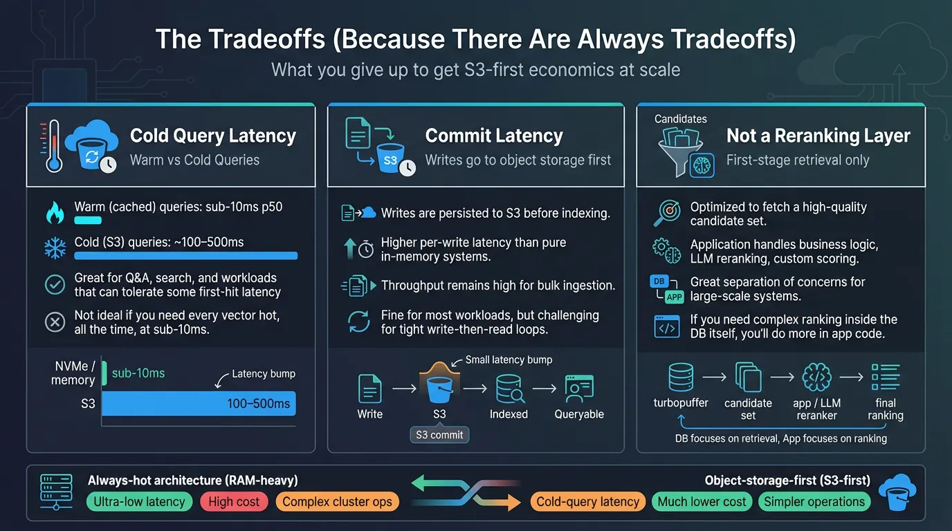 But if your use case requires consistent sub-10ms latency on the first query to any vector, even vectors that haven't been accessed in months, an always-hot architecture might be the right call, despite the cost.